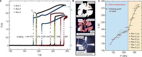 该研究团队的实验方案设计如下:1)将碳和硫以1比1摩尔比混合,球磨成5微米以下的颗粒,随后装载到一种称为“金刚石砧座”的装置中;2)氢分子充入其中,扮演反应物和传压介质的双重角色;3)利用两颗金刚石挤压,给样品施加4 GPa的压强,并用波长532 nm的紫外光照射数小时;4)在压力和辐射的双重作用下,驱动S-S键的光分解,形成硫自由基,并与氢分子反应生成硫化氢;5)迅速微调压强和激光位,最终制出均匀透明的C–S–H晶体结构。然后研究人员通过对电阻、磁化率、电输运和拉曼光谱的测量,观察到C–S–H晶体在267±10 GPa压强下,临界温度约288 K时,具有零电阻、在施加的磁场下临界温度的降低、冷却时从材料内部排出磁场(迈斯纳效应)等三个超导体特征,并证实了从分子到金属以及超导的一系列结构和电子相变。这充分说明,有机衍生的C-S-H在267±10 GPa压强下取得了约15℃的超导临界温度,创造了新的世界纪录!
