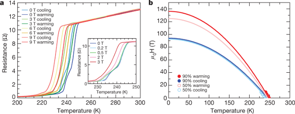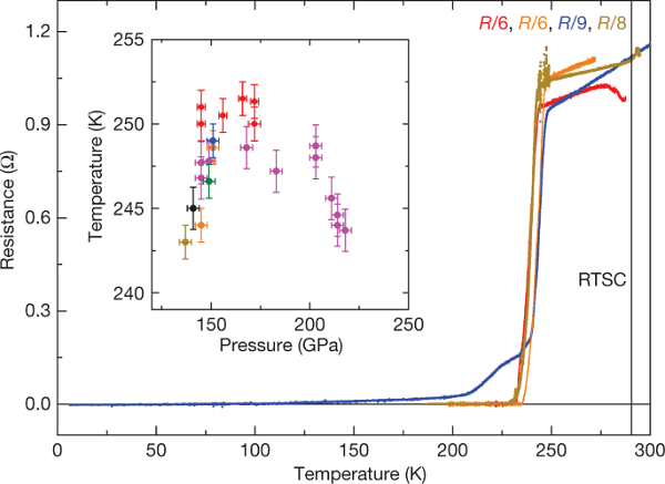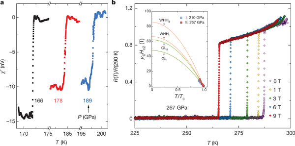美国芝加哥大学、德国马斯克普朗克Mikhail Eremets领导的团队,发现了临界超导温度能达到–23℃的高温超导体新材料:超氢化镧。研究人员用仅几微米大小的镧金属样本,放进一个打孔且充满液态氢的金属箔中,接着将此设备连接电线,然后对其施加高达150~170 GPa的压力——将近地球海平面压力150万倍。研究人员以激光光轰击样本,使镧和氢结合形成氢化镧,最后用X射线束测量该材料的结构与成分。研究人员证实,这种材料在-23 ℃时表现出超导4种特性中的3种:零电阻、外加磁场下临界温度降低、当一些元素被不同的同位素取代时出现温度变化,只差没有检测到迈斯纳效应。