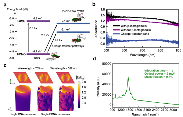 a) β-乳球蛋白分子在硅、PCNA和商业金属基底上的拉曼光谱测量对比。β-乳球蛋白分子在PCNA基底上的拉曼信号强度是金属基底上的10倍。