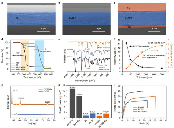 图二、基于PI的CCs的材料制备和结构表征(a-c)PI、PI-TPP和PI-TPP-Cu薄膜横截面SEM图像;