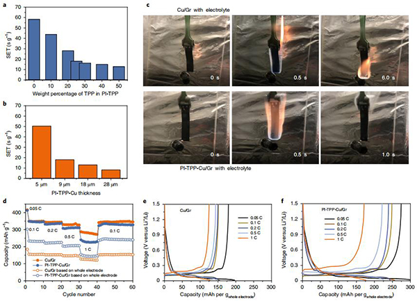 (a,b)在有电解液的情况下,PI-TPP-Cu/Gr电极在不同阻燃剂含量和不同集流体厚度中的阻燃效果;