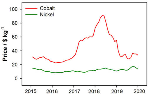 图一 近五年锂电池关键原材料(钴和镍)价格变化。图片取自[2].