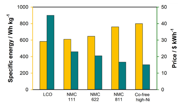 图二 锂电池关键电极材料能量密度和价格对比。图片取自[2].