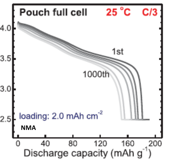 Arumugam Manthiram等则选择从另外一个方向,以NMC为研究对象,尽可能的降低材料中Co的含量。[3]他们选择将Co移除,增加一种新的掺杂元素:Al。从而获得一款新的无钴高镍材料:LiNi1−x−yMnxAlyO2 (NMA)。该材料同样展现了优异的电化学性能,如图四所示。该款材料在C/10的倍率下,能获得218 mAh g-1的容量。该数值基本等同于NMC811的容量。同时,如果将改材料应用于软包电池中,循环1000周以后,容量保持率在85%。图四是NMA软包电池的电化学充放电曲线。[5]