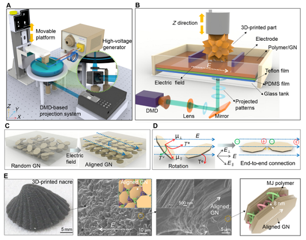 因其在体育、交通、航空航天和生物医学工业中的战略应用,轻质、坚固的结构材料备受关注。珍珠母表现出高强度和高韧性,因为其类砖和砂浆结构。基于此,南加州大学Yong Chen团队提出了一种通过电辅助3D打印技术,来构建具有复杂三维(3D)形状的类珍珠层结构。在3D打印过程中,石墨烯纳米片通过电场(433V cm-1)排列,并作为砖块,聚合物基质在其间作为砂浆。3D打印的类珍珠母结构显示出轻质特性(1.06 g cm-3),同时显示出与天然珍珠母相当的比韧性和强度。此外,当将其用作3D打印的轻型智能外保护层,可以通过电阻变化来感知其损坏。这项研究突出了生物传感结构的潜在价值,具有机械增强和电自感知能力,用于生物医学应用、航空航天工程以及军事、运动装甲。
