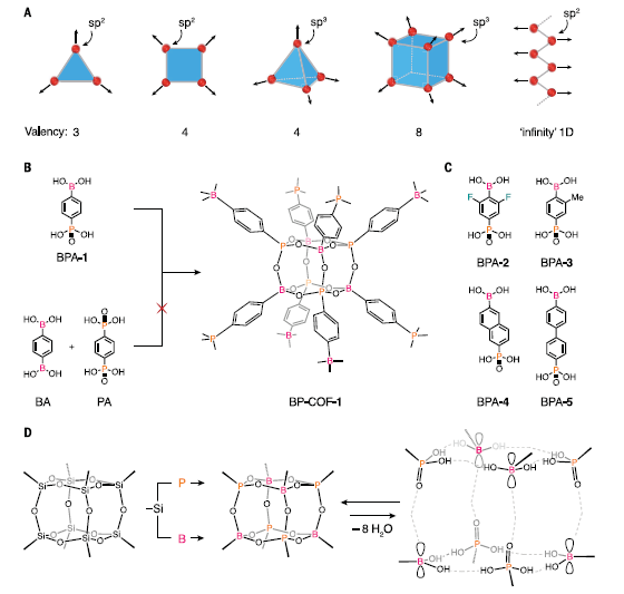 共价-有机框架(COFs)中构筑单元的价态(连通性)主要为3和4,分别对应三角形和正方形或四面体。近日,美国加州大学伯克利分校Omar M. Yaghi教授报告了一个策略,使COFs具有8价(立方体)和“更大”(棒)。将硼和磷作为碳基元素的等电子组合而设计的连接剂1,4-硼苯基膦酸被浓缩成多孔的多立方结构(BP-COF-1),其形式为(–B4P4O12-)(–C6H4-)4。作者用X射线粉末衍射技术对其进行了表征,发现了与苯基连接的立方体。异构体形态(BP-COF-2至5)同样被制备和表征。由棒状单元组成的结构同分异构体COF (BP-COF-6)的大单晶也被用同样的策略合成,从而推动COF化学进入一个新的价态。该项研究成果以“Design of higher valency in covalent organic frameworks”为题,发表在Science上。DOI: 10.1126/science.abd6406.