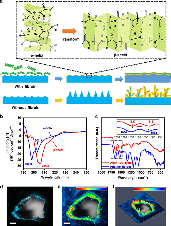 在与锂金属负极表面接触后,其独特的亲/憎水界面能够诱导蛋白质分子的二级结构发生转变。在通常情况下,丝素蛋白分子以α-螺旋结构为主,其憎水基团主要被亲水基团包裹在螺旋体内部。而在与锂金属表面相接触后为了获得更大的接触面积,α-螺旋型的蛋白质会展开成为以β-折叠为主的二级结构形态,并平铺在锂金属表面,加强了其对金属锂表面的吸附。