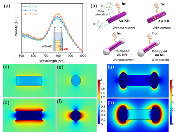 图4:(a) 哑铃状Pd-Au 纳米棒在不同交流电场下的UV-Vis吸收光谱. (b) Au纳米棒与哑铃状Pd-Au 纳米棒在有无外加电流下的COMSOL模拟示意图, 视图方向①和②分别为平行和垂直入射光的方向。由COMSOL模拟得到的Au 纳米棒有无外加电流沿平行入射光视图方向的LSPR诱导的感应电场 (c-d) 和垂直入射光视图方向 (e-f). 由COMSOL模拟得到的哑铃状Pd-Au 纳米棒有无外加电流沿平行入射光视图方向的LSPR诱导的感应电场 (g-h).