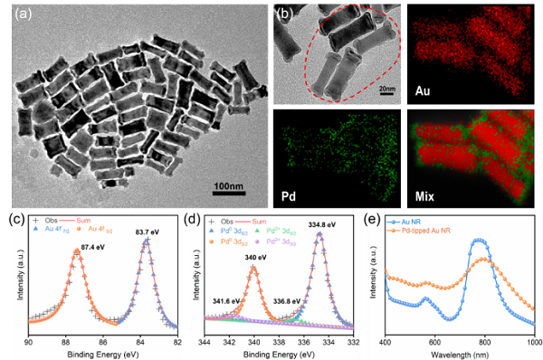 图1:(a-b) 哑铃状Pd-Au 纳米棒TEM和Au, Pd及混合图像的TEM-EDS元素分布图像. (c-d) 哑铃状Pd-Au 纳米棒的高分辨率Au 4f 和Pd 3d XPS光谱. (e) Au 纳米棒和哑铃状Pd-Au 纳米棒的UV-Vis吸收光谱.