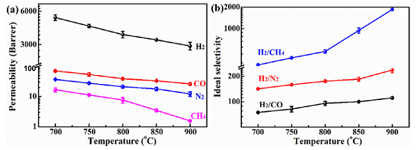 图6 (a)单一气体渗透率和(b)碳化温度函数的理想选择性(在30℃和0.01 MPa测试)