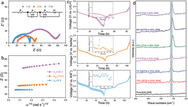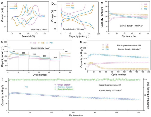图四、LIBs、SIBs和PIBs的电化学及电解液表征