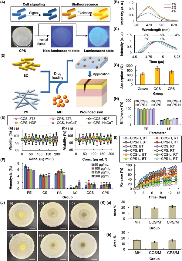 生物荧光是与信息传递相关的功能过程,而响应内部生理信号的能力是细胞的独特属性。受细胞中这种独特信号处理特性以及生物荧光在信息传递中可能发挥的作用的启发,在这项研究中黎教授团队近期开发了一种仿生智能缓释材料,即CPS,它可以将内部化学信号的变化传递给外部的发光变化,以传达有关材料实时状态的信息(图1A) ,以用于持续跟踪伤口治疗中局部药物的递送过程。