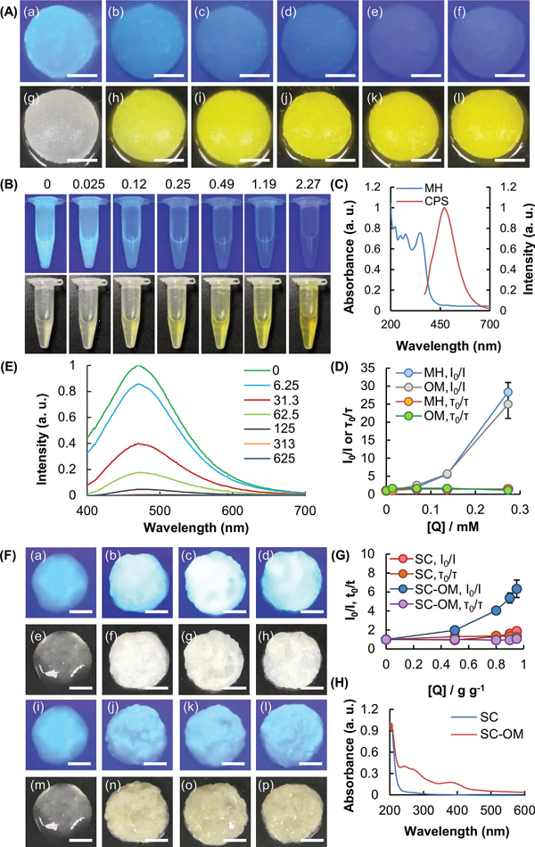 (A)不同MH浓度的CPS / M的a–f)荧光图像和g–l)光学图像:a,g)0 µg µL-1,b,h)0.8 µg µL-1,c,i)1.6 µg µL-1,d,j)2.4 µg µL-1,e,k)3.2 µg µL-1,f,l)4 µg µL-1。