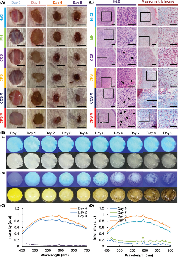近日,香港中文大学(深圳)切哈诺沃精准和再生医学研究院PI黎永富教授的团队报道了一种具有能够针对伤口治疗中双相化学感应内部信号的生物启发药用缓释材料CPS。CPS可以将内部化学信号的变化传递给外部的发光变化,以传达有关材料实时状态的信息,用于持续跟踪伤口治疗中的局部药物递送过程。在跟踪过程中,既不需要复杂的设备,也不需要额外的对比度增强剂。与常规发光聚合物系统(其发射来自π共轭结构)不同,CPS表现出簇集发光(CTE)。在皮肤穿孔组织修复模型的临床前试验中,它成功地加快了伤口闭合的速度,减少了炎性细胞的浸润,并增强了胶原蛋白的沉积。重要的是,类似于可以响应内部信号(例如,内部信号分子的浓度和磷酸化状态)的活细胞,它还可以将内部化学信号(尤其是载药分子数量和氧化状态的变化)的变化转换成其固有发光的变化,从而实现双相化学传感,以防止在伤口治疗中由盐酸米诺环素引起的皮肤色素沉着的发生。此外,CPS还易于制备,且具有生物相容性好、载药效率高、释放可持续性好等优点,在未来的伤口治疗中具有发展成为智能化固态设备的潜力。研究成果以题为“A Bioinspired, Sustained-Release Material in Response to Internal Signals for Biphasic Chemical Sensing in Wound Therapy”发表在国际著名期刊 ADV. HEALTHC. MATER.上。