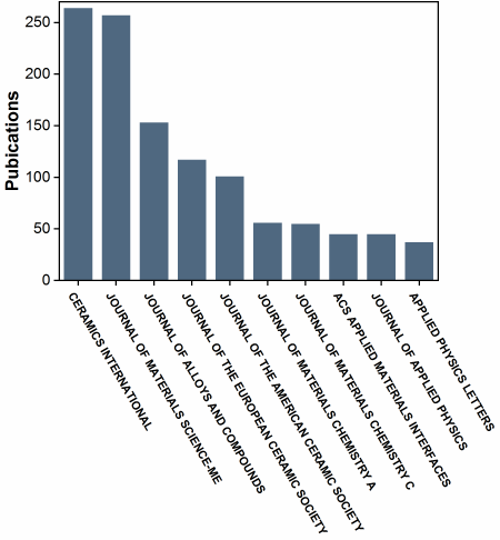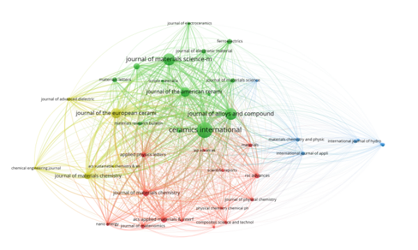 图2.4 展示了发表该领域论文最多的前十大期刊,三大陶瓷刊物掌控了主要发表量,国陶雄居第一!而另一本电子材料领域的专业期刊JOURNAL OF MATERIALS SCIENCE-ME也是不可小觑,其余的材料类期刊则都是材料领域国人占比不低的期刊,但发文量非常小,都不过百篇。位居末尾的是两大应用物理老牌期刊,JAP和APL,但发文量也很小。此外,我们熟悉的材料类顶刊AM也不在前十,可见这一领域想发表在材料综合期刊上难度不小。这与其过于细分的研究范围有关,只有少量研究能具有更广泛的读者群,大部分的科学点都集中于陶瓷和电子材料领域,这一推断和本文接下来的引文分析不谋而合。