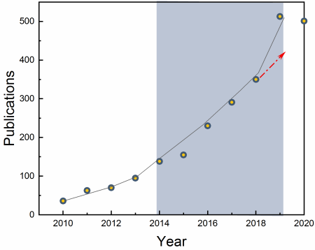 图2.2展示了2010年以来该研究方向的发文趋势, 这一领域最早的论文发表区间是1997年左右,起初只有10篇左右的工作,而十多年后(2010)的发表量仍然不过百。真正的研究热潮是从2014年开始,而那时正是能源领域论文开始增长的时间段;可见,这一方向的“热门”并不是学科研究方向发展自我突破的区域,而是在整个能源大背景下的“再发掘”,毕竟介电材料能够储存电荷和能量是一直以来的知识共识,只不过早期的研究更加关注介电过程,而没有将其同更绿色的能源应用关联。