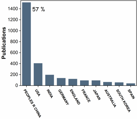 从图2.3的国家和地区发表分布中,我们清晰的捕捉到,中国大陆是这一领域当仁不让的绝对巨擘,总发文量占据了该领域近60%的份额,将一众小弟远远甩在沙滩上。特别需要关注的是日本,没有进入前五名,这同笔者前不久关于HfO2的分析文章中(日本第三)的排序有着巨大的差异。笔者猜测,可能日本学者觉得其真正应用潜力也许尚不成熟,或者在科学上难以有实质性的突破?