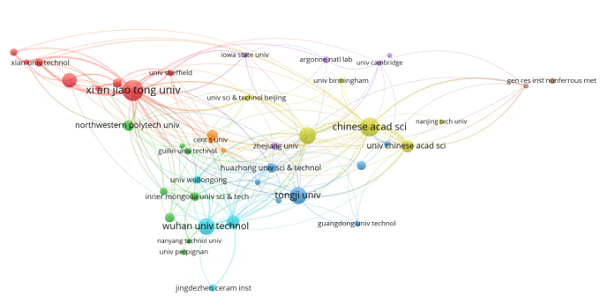 图3.2的各主要研究机构间的合作具有一定的区域发展特征。作为这一领域最大的发文机构,西安交通大学主要和陕西省内的部分高校有更加紧密的合作,并且同英国的少数机构有一定的合作,这一现象并不意外,充分反映了这几个机构研究人员之间长期以来在电子陶瓷领域的师承和合作关系,区域性研究团队特征明显。从上图中,我们也可以得到一个重要信息,这一领域的研究人员集中度很高,都是传统的电子陶瓷类研究机构,一些物理和化学类颇有名气的机构基本上很少涉足这一领域。这带来一个不容忽视的问题,研究群体多样性不足,学术近亲发展现象会限制领域的学术思维的开拓,对于颠覆性和独创性科学思维的凝练是不利的。未来,期待更加多元化的机构群体的加入,搅动起更加澎湃的思想浪花。