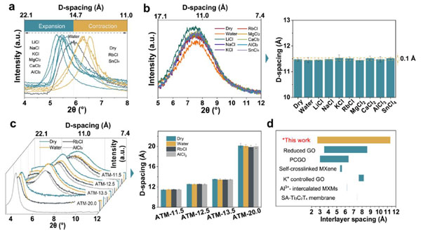精确和超快离子选择性在环境、资源和能源等多个领域均具有重要意义。在海水淡化、水净化、离子回收、离子提取和储能等具体应用中,不同的混合离子系统需要构建合适的通道结构,以便从混合离子体系中实现伴生离子与目标离子的精确、快速分离。在目前可行的分离策略中,膜技术因其清洁、可靠、高效等优点而被认为是选择性离子分离的重要技术。近年来,二维层状膜由于其超快的水输运和精确的选择性等异常输运现象引起了人们的研究兴趣。分子/离子在层状膜中的传输发生在两个相邻纳米片之间形成的纳米受限通道中。实验研究和计算机模拟都证实,当离子传输通道直径减小到埃米量级时,离子脱水合机制可以有效地提高离子选择性。然而,水分子与离子的插层使二维层状膜中受限通道的直径(也称为d间距或层间间距)在水环境中工作时显著增大,使得离子筛分效率远低于理论预测。因此,开发高效离子筛分的二维层状膜的第一个挑战是抑制插层诱导的受限通道膨胀趋势。此前,该课题组提出Ti3C2Tx膜的层间距可以通过加入水凝胶柱来固定,并证实表面化学特性的细微差异可以形成明显不同的离子选择性(Nature Communications,2020, 11, 3540)。然而,由于无法实现膜结构的有效调节,2D层状膜空间位阻效应的潜力还未得到充分研究。此外,由于水凝胶柱撑纳米通道直径较大(7.4Å),对一些重要的诸如海水脱盐等离子分离功能仍具有较大难题。综上所述,根据以往的研究,在各种离子筛分应用中,如何简便有效地抑制普遍存在的膨胀趋势,在此基础上,在较大尺度范围内精确调整受限通道的直径,以满足不同的离子筛分要求,仍然是一个技术难题。