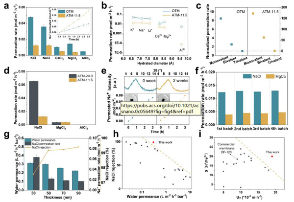 (g)随着ATM-11.5厚度的增加,NaCl截留率、Na+渗透率和水渗透率的变化。