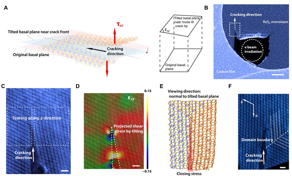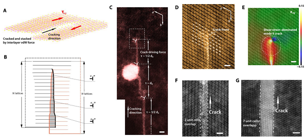 本工作直接揭示了二维材料由于特殊的维度效应,少见地在剪应力影响下在断口后侧发生晶格重构,并且和材料断裂过程互相影响,增加了这种二维材料的脆性。本工作还同时首次观察到了二维材料中特殊的Mode II面内剪切断裂模式,提出了制造二维材料原子级堆叠的一种崭新的方法。本项工作更深入地理解了二维材料等低维材料的断裂机理,为将来二维材料的实际应用铺平了道路。