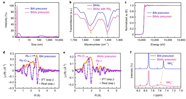 (d, e) 用BAI (d)制备的前驱体溶液和用BAAc (e)制备的前驱体溶液在Pb L3边缘处r空间的扩展x射线吸收精细结构光谱;