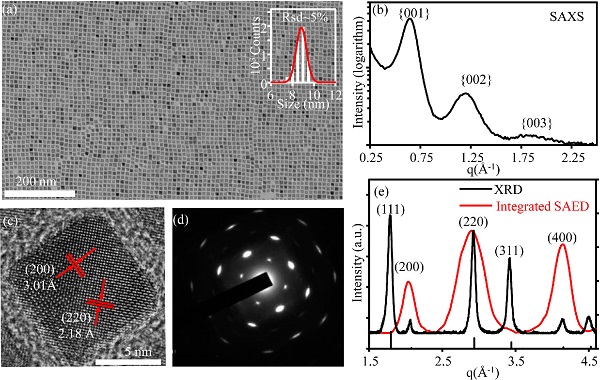 (b-e)立方型CdSe纳米晶的小角X射线散射(SAXS)图像,高分辨TEM图像,选择性区域电子衍射(SAED)图像和X射线粉末衍射(XRD)/集成SAED图像。