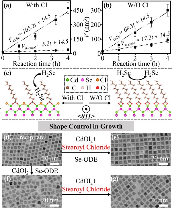 (d-g)作为沉淀相的纯化立方形QDs,添加硬脂酰氯再生得到的QDs,不含硬脂酰氯的再生反应产生的QDs,以及Cd(Ol)2和硬脂酰氯混合溶液转化而来的QDs的TEM图像。