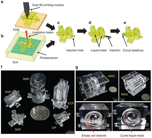核磁共振(NMR)和磁共振成像(MRI)技术已取得巨大进步,其在肿瘤成像、生物材料检测、物质分析、原位电化学反应监测等领域得到了广泛的应用。射频线圈作为磁共振系统的核心部件之一,对磁共振实验结果的质量有着重要的影响。传统的磁流变线圈通常采用手工缠绕和印刷电路板光刻技术制造,这通常需要劳动密集型制造和二维制造工艺。因此,对于复杂或不规则的三维结构的线圈,尤其是在小型化的要求下,制造线圈是不精确和耗时的。此外,一些非常规核磁共振实验,如微升级样品检测和生化反应监测,需要定制的三维微流控样品结构与射频线圈集成。对于不同形状和尺寸的MRI样品或微流控系统,很难精确地拟合射频均匀区域,由于填充因子较低,导致信噪比(SNR)降低。