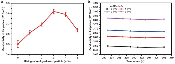 (a)由金微粒和镓组成的LM浆料在不同配比下的电导率。