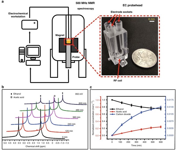 (b-c)乙醇氧化反应过程中乙醇、乙酸和二氧化碳浓度的原位1H-NMR谱和时间分辨变化。