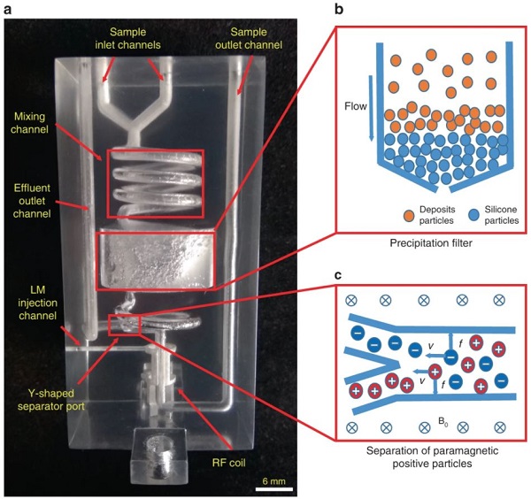 近日,厦门大学陈忠教授、游学秋副研究员、孙惠军工程师(共同通讯作者)等人报道了利用3D打印和液态金属填充技术来制作用于磁共振实验的集成射频探头前端。具有微米精度的三维打印探头前端一般由液态金属线圈、定制的样品腔和射频电路接口组成。结合不同的金属颗粒,对不同配比的液态金属和金属颗粒进行了优化。三维打印探头能够进行常规和非常规磁共振实验,包括原位电化学分析、连续流顺磁颗粒和离子分离的原位反应监测以及小体积样本磁共振成像。由于三维打印技术的灵活性和精确性,可以允许在微米尺度上精确地获得复杂的线圈几何形状,缩短了制作时间,扩展了应用场景。该研究利用高精度3D打印和液态金属灌注技术制备出包含有射频线圈和定制化样品管道结构在内的一体化磁共振射频探头前端,克服了传统磁共振三维微型线圈成型困难、与样品腔匹配程度差等问题,提高了探头的信噪比,为定制化的磁共振检测提供了新思路。该文章近日以题为“3D-printed integrative probeheads for magnetic resonance”发表在知名期刊Nature Communications上,第一作者为厦门大学博士研究生谢君尧博士。