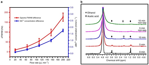 (a)通过半峰宽(FWHM)显示了不同流速下的顺磁性离子(0.01 mol L-1 Mn2+)的洛伦兹力分离效率。
