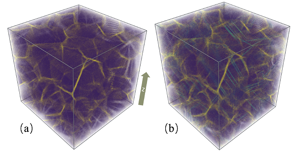 铜纳米晶粒(包含一千万个原子以上)的拉伸模拟。(a)具有面心立方晶体结构的铜原子(紫色),晶界原子(黄色)。(b)沿z轴拉伸10%后的铜纳米晶粒产生位错结构(青色)