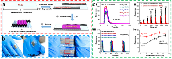 图1 通过纳米材料直接集成在可拉伸基底(模板)上和可伸展结构设计制成的各类可拉伸气体传感器