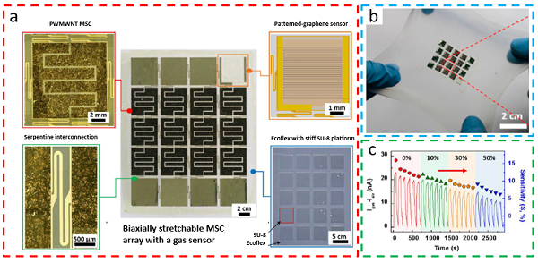 可伸缩气体传感器通过将气敏纳米材料集成到软弹性基底或者可伸展结构上,因而具备一定的变形能力,不会因机械变形而损坏。纳米颗粒、纳米线或具有纳米厚度的薄膜常被用作传感材料。而典型的结构设计策略则包括直接沉积气敏纳米材料到可拉伸薄膜或多孔模板(如织物、海绵或纤维网)上,岛桥预应变设计中的褶皱结构布局和蛇形互连,以及各种应变隔离方法。由于可拉伸气体传感器在生物标志物实时监测方面的巨大潜力,对传感器感应材料和结构设计方面的总结显得十分必要。