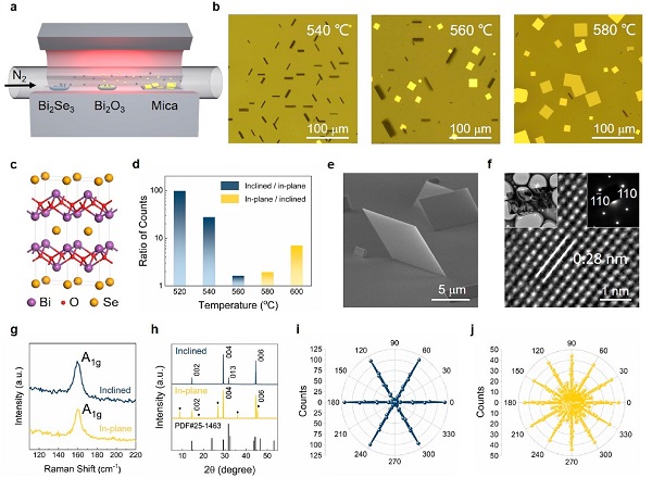(b)在不同的炉膛中心温度下,立式和面内Bi2O2Se的生长。