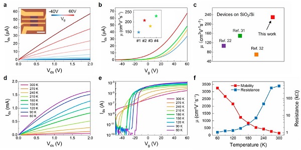 图3 倾斜Bi2O2Se薄膜转移到SiO2/Si衬底上的场效应晶体管的器件性能