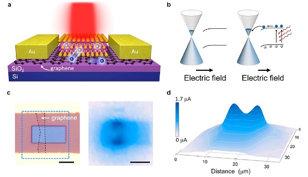 (c)扫描光电流成像;左图为光学显微镜照片,右图为光电流成像结果。