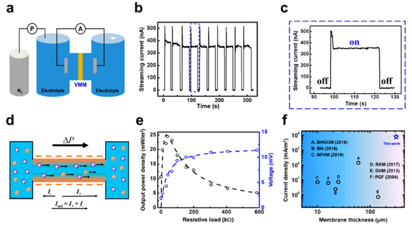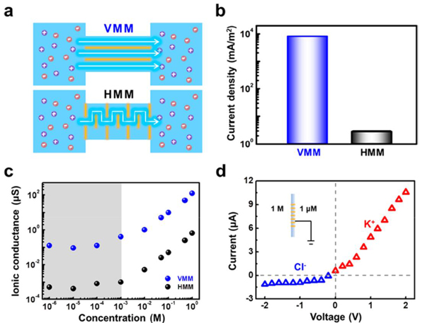 (b)液压驱动下VMMs的电流密度比HMMs大3个数量级。溶液为0.3 M KCl。 压力为50 kPa。VMM和HMM的厚度分别约为320 μm和8 μm。