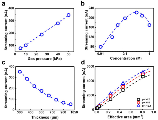 (d)动电流产生的原理:当离子通过带负电荷的纳米通道时,由表面电荷引起的电荷分离过程产生了动电流。