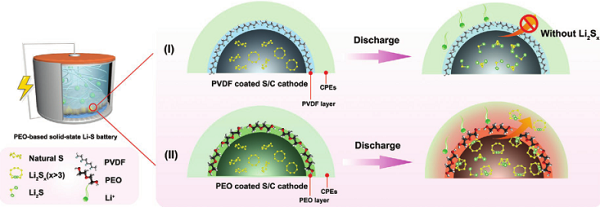 图2 PEO电解质中,PVDF和PEO涂层碳硫正极的机理示意图。