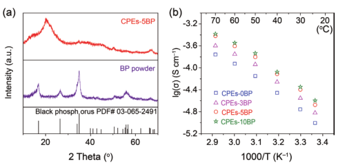 图6 注入黑磷的聚合物电解质的表征。(a)XRD图;(b)离子电导率的Arrhenius图。