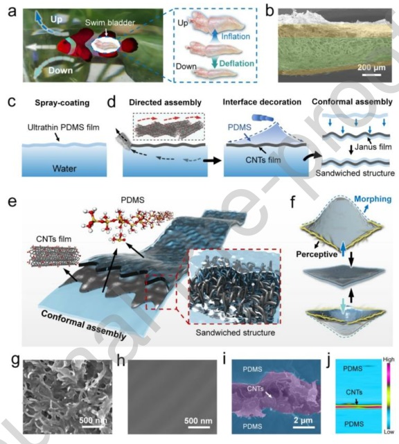 (c)用CNTs/PDMS Janus薄膜来模仿人工鱼鳔以感知水下深度的示意图;