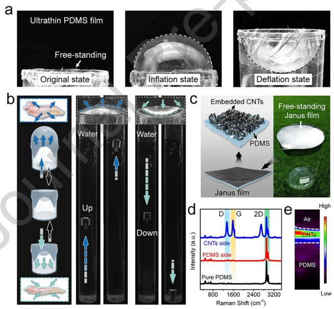 (c)具有良好的保形性和自支撑性能的CNTs/PDMS超薄Janus膜;