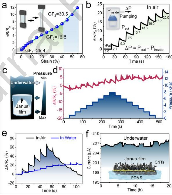 (d)在不同深度的水压下CNTs/PDMS Janus薄膜的ΔR/R0曲线;