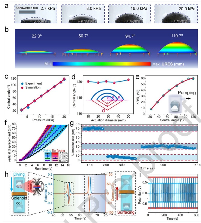 (e)人工鱼鳔驱动器在重复下潜/上浮过程中的实时信号记录。