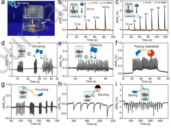 (d-j)人工鱼鳔对人的跺脚(d)(d)、原地踏步(e)、拍篮球(f)、用尺子敲击容器壁(g)、向液面吹气(h)和用直尺搅拌水面(i)时的感知。