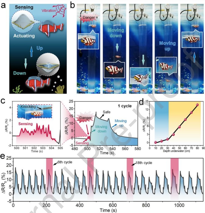 虽然目前已经大量研究了具有类皮肤可拉伸变形行为的弹性体驱动系统,但是还缺乏在同一个系统中感知和变形/运动能力的协同作用,这导致驱动器不能像生物体一样根据外界的刺激响应来调节自身的行为。除了陆地环境之外,水下仿生智能行为,尚未在人工集成系统中得到开发。大自然为我们提供了构建水下智能系统的灵感。例如,小丑鱼的鱼鳔作为一个共振器可以实现对周围环境的感知,并通过进一步的信号反馈来指导鱼鳔可逆的膨胀和收缩行为,以控制在水中的垂直运动。这种水下感知、运动行为和进一步反馈信息的能力,有助于丰富和开发软驱动系统的应用范围。