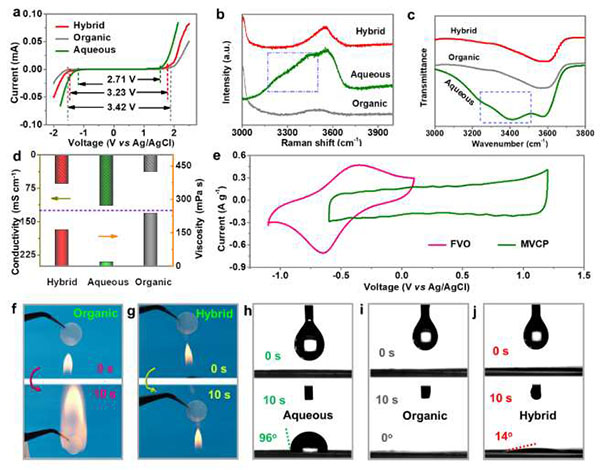 (e)分别以FVO和MVCP为工作电极,在杂化电解质中半电池的CV曲线;